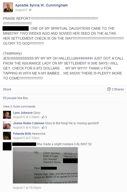 On August 5, 2014, Ms. Cunningham posted a status on her Facebook page stating that one of her supporters came to Ecclesia Worship Center two weeks ago and made a donation, and now, this supporter’s settlement check is on the way. See the screenshot below.